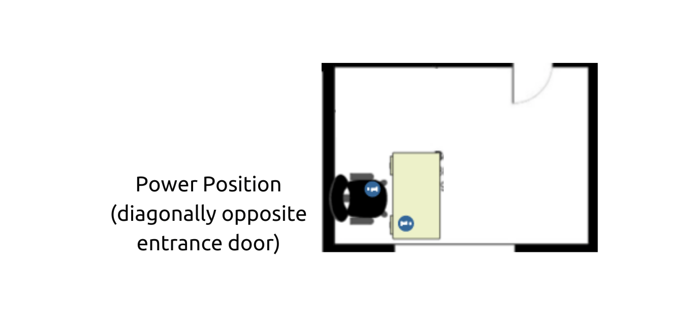 If you are lucky enough to have a room you can use as a dedicated home office then always place your desk in the power position. This is usually diagonally opposite the main door into the room. See diagram above. The feng shui power position gives you a strong location within the room that is protected. Read on for why this is important.