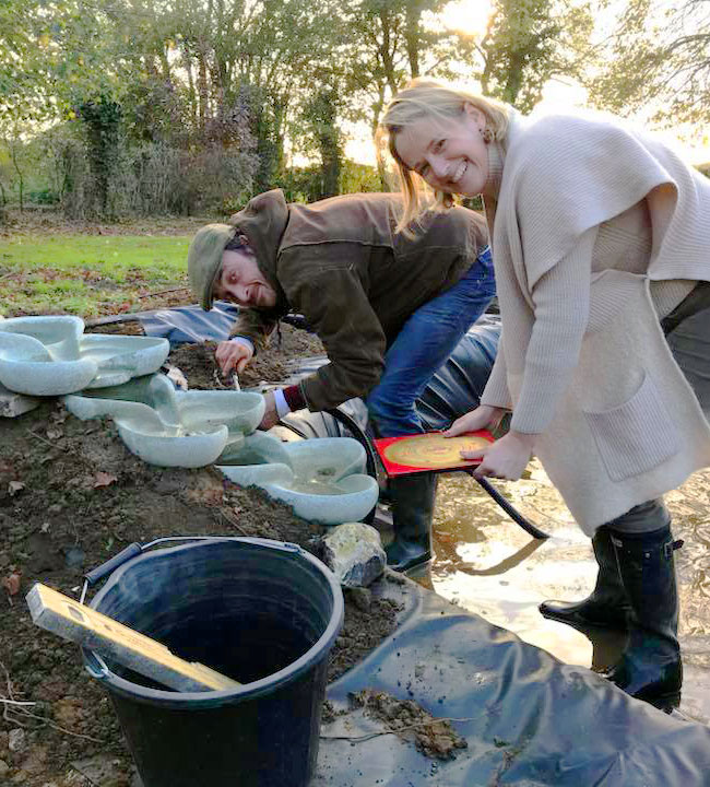 Sarah in Suffolk measuring out the precise angle of water flowing from a Flow Form into a beautiful feng shui pond to enhance the wealth and abundance of the family at this home.